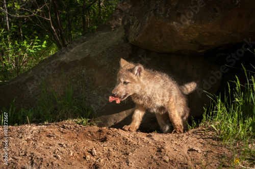 Obraz premium Grey Wolf (Canis lupus) Pup Emerges From Den With Meat