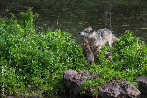 © geoffkuchera, Fototapeta premium Grey Wolf (Canis lupus) Pups Jump Up to Greet Adult Summer