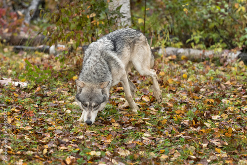 Obraz premium Grey Wolf (Canis lupus) Sniffs Through Leaves Autumn