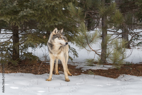 Fototapeta premium Grey Wolf (Canis lupus) Stands in Front of Pine Trees Winter