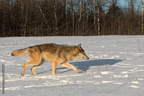 © geoffkuchera, Naklejka premium Grey Wolf (Canis lupus) Trots Right Through Field Winter