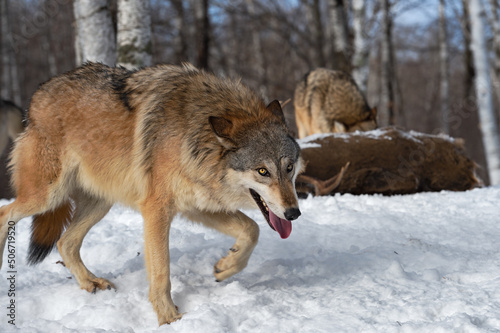 © hkuchera, Obraz premium Grey Wolf (Canis lupus) Walks By Eyeing Viewer Deer and Pack in Background Winter