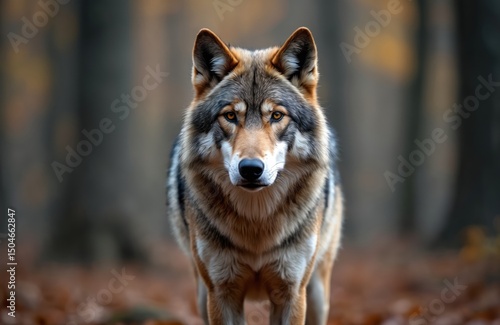 © miss irine, Naklejka premium Grey wolf in autumn forest. Canis lupus portrait. Wild animal staring at camera. Predator in natural habitat. Wildlife scene. Forest background. Calmness and tranquility.