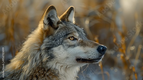 © Arieswanto, Fototapeta premium Grey Wolf Portrait with Golden Eyes and a Drool