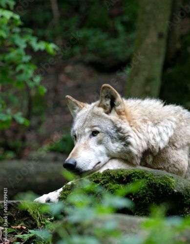 Obraz premium Grey wolf resting in forest (1)
