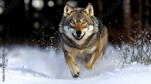 Obraz premium Grey wolf running through snow in forest. Wild life. Timber wolf in snowy...