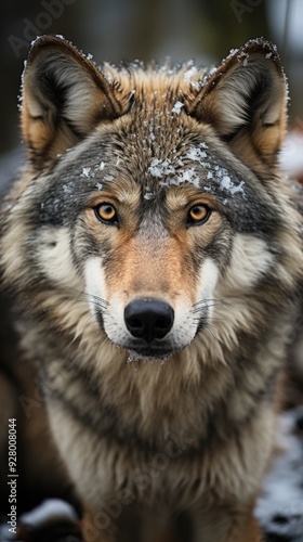 © sk, Fototapeta premium grey wolf setting on snow in the woods at winter with copyspace