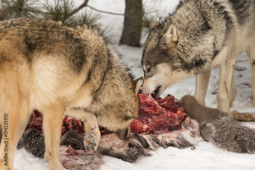 Naklejka premium Grey Wolves (Canis lupus) Pick Meat From Deer Carcass