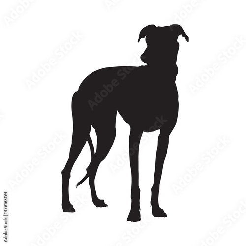 © Amyphotostory, Obraz premium Greyhound Dog Standing On a Front View Silhouette Found In Map Of Europe