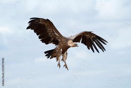 Obraz premium Griffon Vulture (Gyps fulvus) flying in central, clouds and blue sky