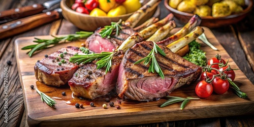 © Collection, Fototapeta premium Grilled Lamb Chops with Rosemary and Cherry Tomatoes on a Wooden Cutting Board