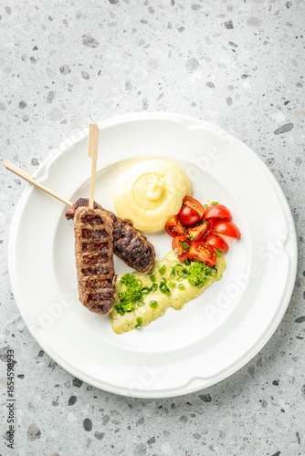 Fototapeta premium Grilled meat skewers with mashed potatoes, cherry tomatoes, and creamy herb sauce on a white plate over a gray speckled surface