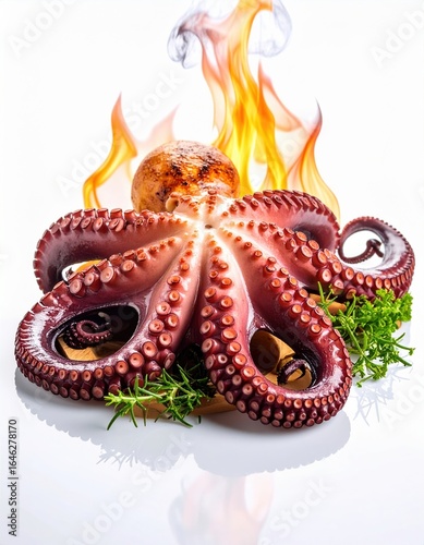 © Simon, Fototapeta premium Grilled octopus on fire with herbs and lemon garnish on white background