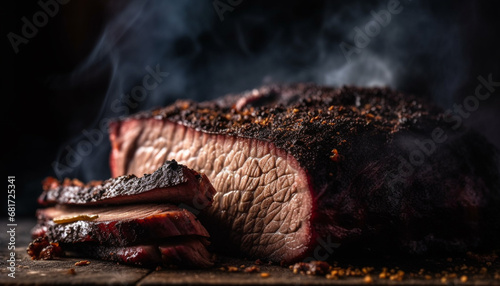 Naklejka premium Grilled pork fillet on wood, flame seared for gourmet lunch generated by AI