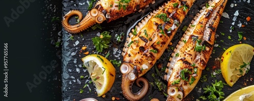 Fototapeta premium Grilled squid with lemon and garlic, 4K hyperrealistic photo