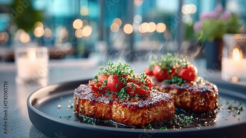 © Nadia, Fototapeta premium Grilled Steak Topped with Cherry Tomatoes and Herbs on Black Plate Fine Dining Experience with Blurred Background