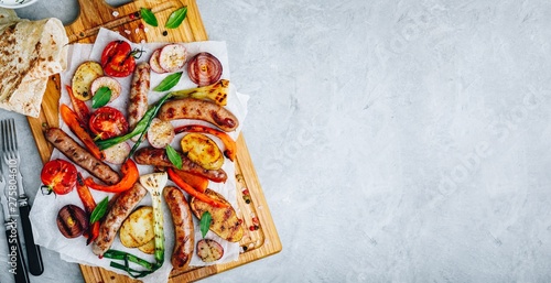 Fototapeta premium Grilled vegetables and sausages on wooden board,