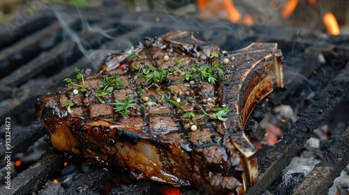 Fototapeta premium Grilling Tasty Steak With Herbs Over Flames Outdoors