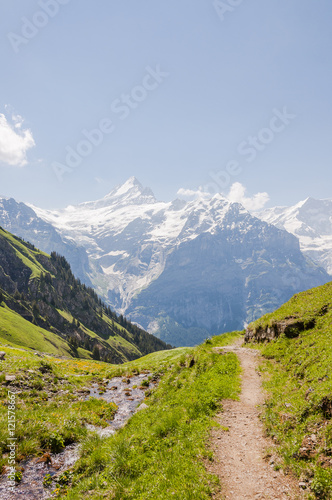 © bill_17, Fototapeta premium Grindelwald, Dorf, Berner Oberland, Wanderweg, Waldspitz, First, Alpen, Schweizer Berge, Schreckhorn, Sommer, Schweiz