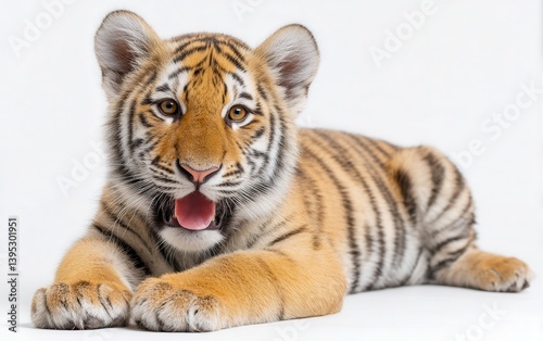 © Svitlana, Obraz premium Grinning tiger cub with bright eyes, relaxed pose, pure white background, playful wild animal expression
