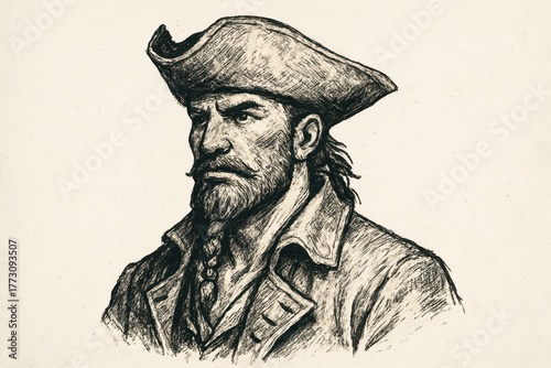 © Bijac, Fototapeta premium Gritty bearded pirate captain portrait on white with tricorne hat and weathered coat