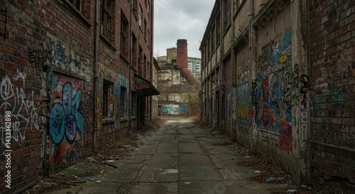 Fototapeta premium Gritty Urban Alleyway – Graffiti, Abandoned Buildings, and Post-Industrial Decay