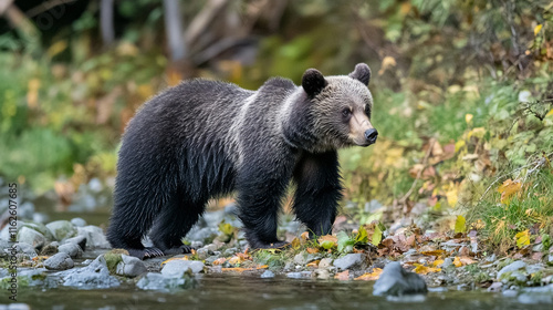 © Sadia, Fototapeta premium Grizzly bear exploring a river bank in a lush forest during autumn