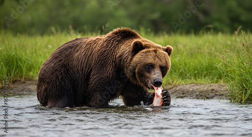 © odzie, Fototapeta premium Grizzly Bear Feasting on a Salmon While Standing in a Shallow River