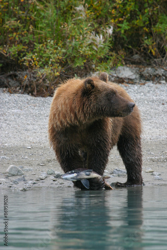 Obraz premium grizzly bear holding salmon next to an alaskan lake