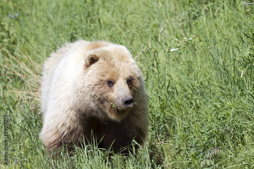 Fototapeta premium grizzly bear in the wild eating grass