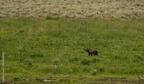 Naklejka premium Grizzly Bear Pauses In Open Meadow