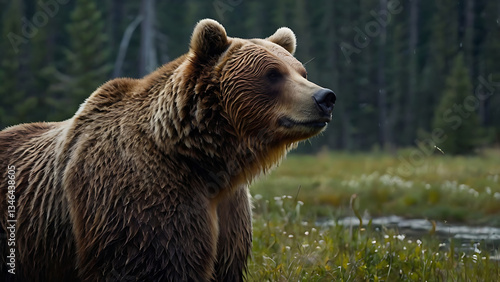 © Farizal, Fototapeta premium Grizzly Bear Portrait in Wild Meadow with Forest Background
