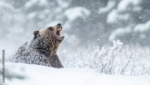 © BISMILAH, Obraz premium Grizzly Bear Roaring in a Snowstorm