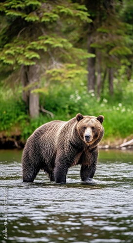 © Mobiles, Fototapeta premium Grizzly Bear Standing Alert in an Alaskan Wilderness River With Dappled Light (1).jpg