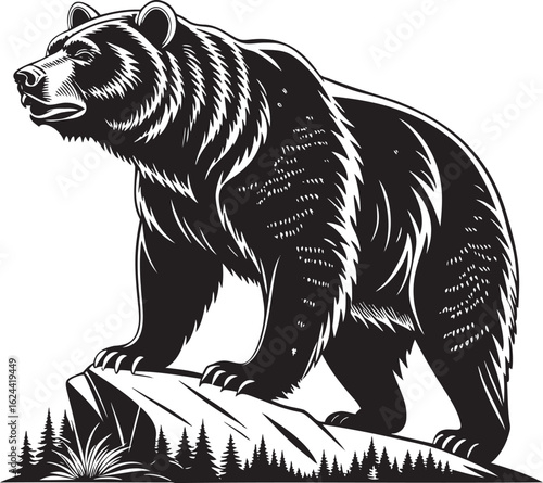 © MDYeakub, Obraz premium Grizzly bear standing on rocky outcrop black and white