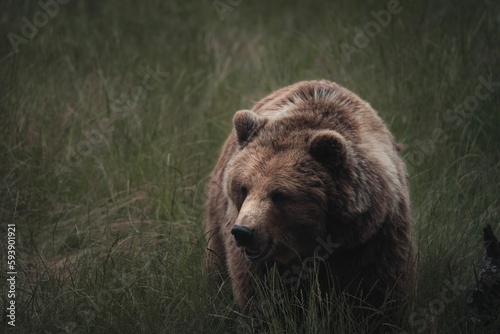 Fototapeta premium Grizzly bear (Ursus arctos horribilis) walking around in a grass field