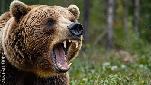 © Valeryi, Fototapeta premium Grizzly bear with open mouth in the summer forest.