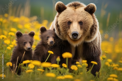 Obraz premium Grizzly Mother and Two Cubs On Mountain Slope