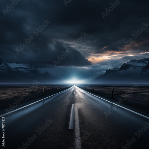 Fototapeta premium große ausfahrtstraße staße landstrasse autobahn bei nacht genrativ erstellt, dunkelheit, wolken, glätte gefahr, sicht, himmel wolken nacht polarlichter einsam einsamkeit