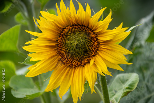 © URS.INHO, Fototapeta premium große gelbe Blüte und Samenkerne einer Sonnenblue zentral in der Mitte des Bildes mit grünen Blättern im Hintergrund