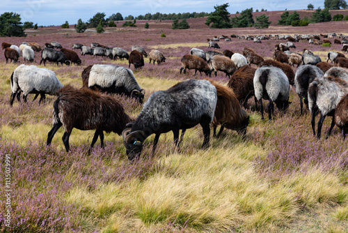 © S. Lorenzen-Mueller, Obraz premium Große Heidschnucken- und Ziegenherde in der Lüneburger Heide bei Niederhaverbeck