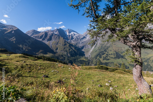 Fototapeta premium Großglockner im Sommer, Baum Wiese und Berge