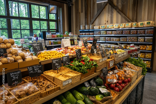 © Oleksandr Umanskyi, Fototapeta premium Grocery aisle filled with various snacks and cereals on display in a well-organized market during daylight hours