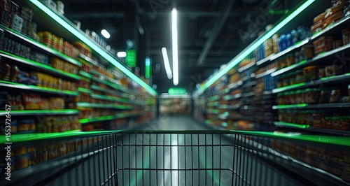 © Rahul, Fototapeta premium Grocery store aisle with shopping cart in the foreground