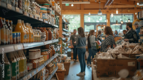Fototapeta premium grocery store with shelves stocked with products and customers shopping.