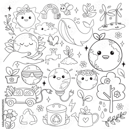 Fototapeta premium Groovy Earth Day Doodle Cartoon Style Hand Drawn Elements Outline Coloring...