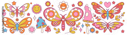 Fototapeta premium Groovy flower and butterfly collection with retro vector graphics in vintage style. Vibrant mushroom motifs, smiling blossoms, hearts and stars - psychedelic design elements for nostalgic decor.