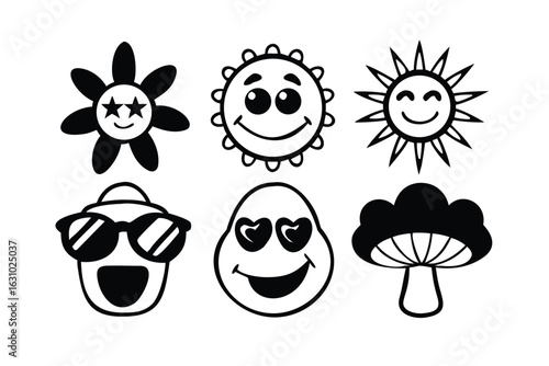 © revpy, Fototapeta premium Groovy Retro Cartoon Mascot Vector Set. Cute 70s Style Smiley Face Illustrations