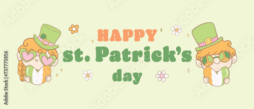Fototapeta premium Groovy st patrick's day banner, cute happy leprechauns hold heart cartoon...