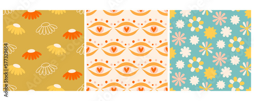 Fototapeta premium Groovy Summer Flowers Seamless Pattern Set